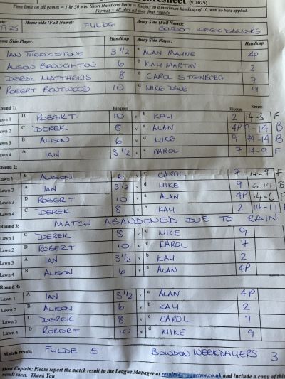 The 2nd round started with some light drizzle which before long turned into steady rain which saw us swapping umbrellas over as we took our turns on the lawns. Obviously used to playing in damp conditions - albeit not This season! - we took 3 of the 4 games with wins for Robert, Derek and Alison.
