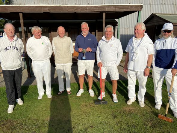 Beautiful sunshine today for our end of season new members golf competition. The format today was a round robin with 5 members taking part. Cyd was keeping the scores . All players were given 3 bisques to get them used to using their extra turns in competitive games. At the end of round 3 John was leading with a final game against Robert to go. It was a hard fought game with John claiming victory. Congratulations to John winning the B.I.G. trophy after winning all his games. His handicap has now improved to 11. Well done to all for a lovely day.