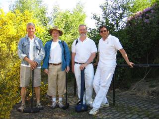 The relentless heatwave relented slightly as Lee, Andrew, Martin (c) and Leonard shared the morning doubles. In the afternoon singles Lee's opponent [conceeding 3 bisques] underestimated the danger when he stopped his first ball at rover. Lee duely peeled it and pegged it out in a good reply going on to win the three ball ending.