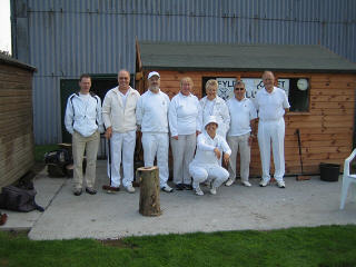 Peter, Liz (c), Lee and Terry had a good day. A closer match than the score suggests. The doubles in the morning went closely to Fylde. The Wilson and Wilson pairing winning +1 on time and the partnership of Lee and Terry winning + 5. In the afternoon Peter won his match +7 in an interesting game with a one ball ending. Soon after Liz also won +7 having pegged oppo out. Lee fought back to win +7 after his opponet had used bisques to gain a lead. Terry kept his nerve and completed the team's perfect score with a golden hoop win which was also his first match victory since moving up to handicap play.