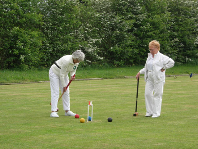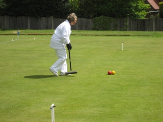Ashby’s team arrived in good time and comprised Tim King (4 ½ ), Derek Buxton (10), Mick Haytack (10) and Jeremy Staley (10). The bisques were definitely to Fylde’s advantage! In the morning Leonard and Betty paired up for the doubles match against Derek and Jeremy. This they won +2. Terry ran out of bisques too early against Tim who played an excellent game on our difficult lawns and won +6. Martin had a comparatively easy win against Mick +11. At lunch Fylde were 2 – 1 up and needed two of the afternoon games to win. The afternoon games were played in handicap order. Terry won +10 against Derek taking quite a few attempts to run the final hoop. Betty could not find form and lost to Jeremy – 13. Leonard lost to Mick – 7. The final game between the two captains Martin and Tim was a tight affair which ran to time. Tim had trouble hitting in on our undulating lawns and Martin managed to keep him out of the game to win +4 on time.