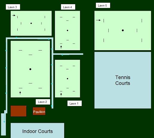 This will see a full lawn with corner 1 where short lawn 2 corner 1 was. This area is draining very well at present. A ditch will be dug on the East boundary of this lawn running towards the corner of the indoor courts where there is an existing drain. This will be left open during the winter and if it improves the drainage it will be covered for the season. We have permission to remove the broken tennis net posts separating lawns 5 and 6. This will provide a second full lawn with corner 1 where corner 4 used to be on lawn 5. Both full lawns will also function as 2 short lawns. The remaining area ( where short lawns 1 and 4 used to be) will be large enough for two more short lawns. There will also be room for a third short lawn at the north end of the new full lawn ( Where short lawn three was but the other way on). However these areas are currently the wettest and it remains to be seen if the proposed ditch will provide enough drainage to keep them open during wet weather.