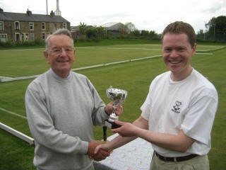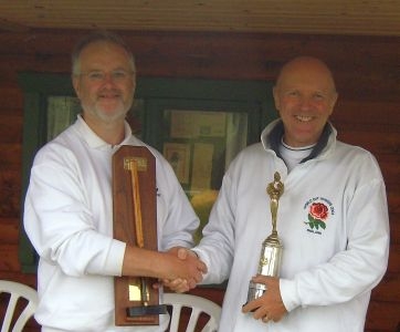Terry, pictured here with runner up John Lucas, becomes the third Fylde member to have won the Northwest Federation's Millennium Trophy. Held at Pendle & Craven this year the twelve contestants Battled through constant rain on day one. Terry went into the second day with 3/3. Sunday was dry but extremely windy. So strong was the wind that the ball stops were occasionally being moved. Terry won both the remaining games, beating Robin Delves in the final. Our other representative, Leo Ainsworth, finished fourth equal.