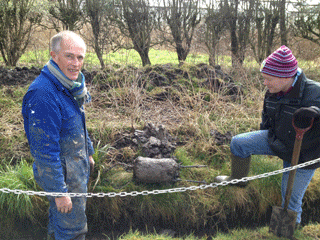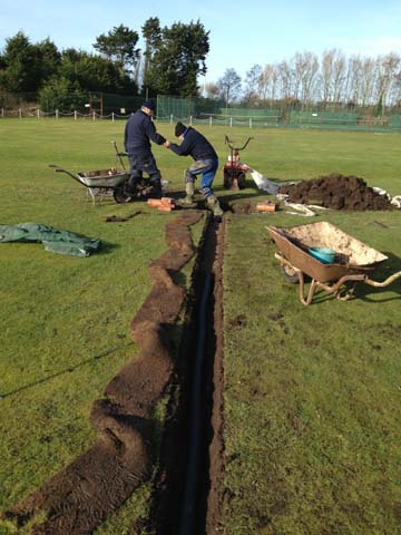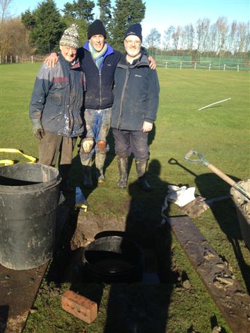 Sump two has been sunk and a drainage channel has been dug from the middle of lawn one. The drainage channel has been laid with a drainage pipe and gravel. Hopefully we will have the only dry grass on the Moss. Picture shows Philip being helped out after getting stuck in to the job too literally!