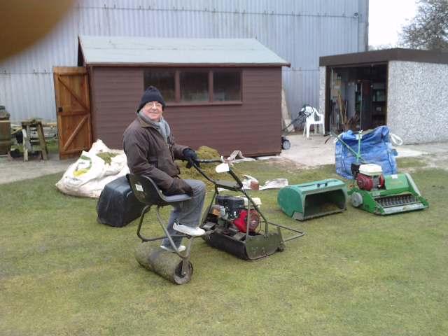 Ian cut the lawns with the Webb mower whilst I used the Dennis with the borrowed scarifier module. Both machines performed well following the recent annual service and repairs. Geoffrey helped with re-turfing the area near the new lawn 'soak-aways'.