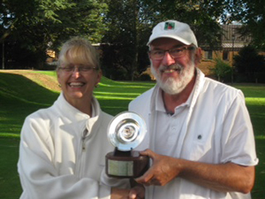 Manager Mike Hills presenting the trophy to Betty.Betty Bates triumphed at the End of Season Weekend Handicap Tournament at Northampton. Betty was paired against old adversary Joe Lennon from Glasgow in a nail biting final. Both players went into the final undefeated on 4 wins. With 6 minutes to go the result could have gone either way but Betty held on continuing to split Joe's balls (oo er missus) ,and making a hoop at a time finally won 21 -16. Lee also played.