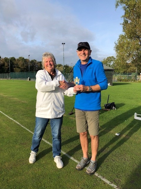 Jan presents the BIG Trophy.5 New members contested the trophy with Claire Pearson beating Colin Galbraith in the final game. Well done to all for playing in the face of storm Arwen.