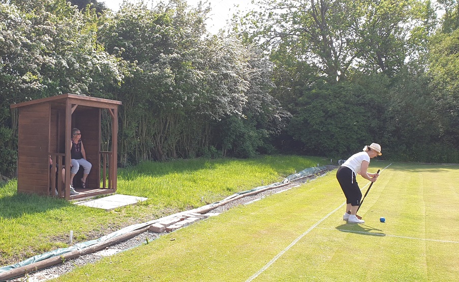 The court booking calendar link is available from our home page and filling up rapidly. The pavillion has a new roof. Work will soon start trying to fill the worst of the dips and hollows we have. As usual the lawn surface profile has moved over the Winter. . Our rovin reporda, Launa Ndawarda, came out of shielding and is amazed at the work that has been done over Winter.