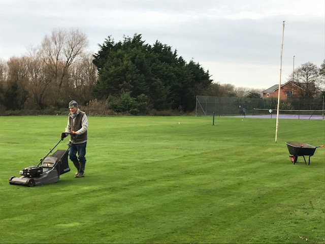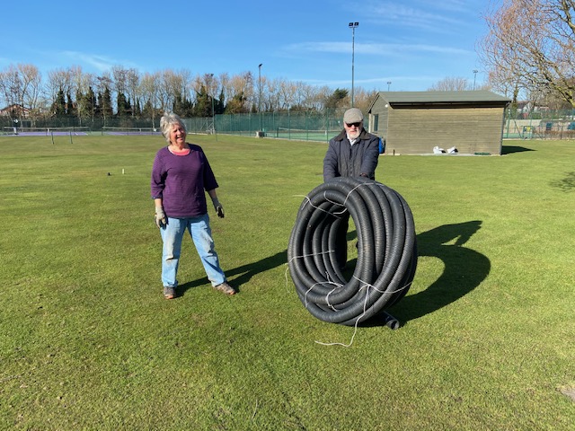Our rovin reporda, Lorna Ndawarda, has been DTL (down the lawns) looking at the the ditch work on the go! She estimates it be finished in a week and thanks the CA who are giving us a grant for this work. Launa was impressed by the skill of our freelance barrow operators, Matt and Jacob. The other helpers Philip, Liz, Lindsay, Sue, Jude and Andrew also took her eye. The expenditure on chippings to fill over the pipeline, provided by Southport, means we will have less maintenance re-digging the ditch in the years to come. Oh, and it should be easier to retrieve a ball from the ditch now, possibly without the use of a safety net!