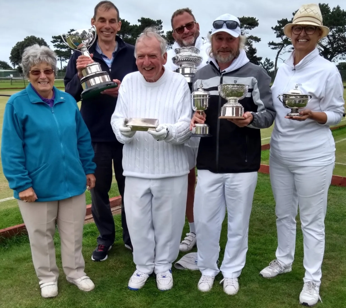 Picture: Janet Kendal, Chairman, Hunstanton Croquet Club presents trophies to the Winners of the 122nd Annual Four Day AC Tournament on 31/08/2021: Back row: Philip Eardley (A-Class) & Peter Thompson (B-Class). Front row: David Houston (Runner-up in the Egyptian), Neil Adams (C-Class & Egyptian); & Betty Bates (D-Class).