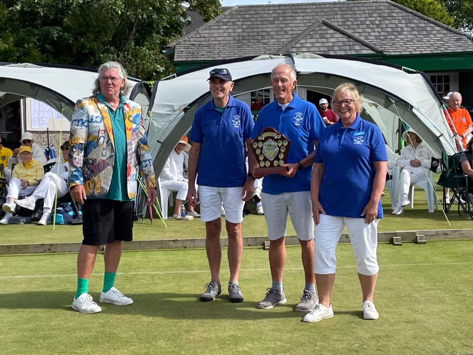 The Short Croquet event Winners get their hands on it from NWFED Chairman Rigge.A true blue mention to our other players: Open GC , Jan and Sue: Hcp GC , Cyd (NPC) Ted, Barbara & Jude: Handicap A/C , Betty (C), Phil, Philip & Ian. OI! VAR! mmmm, we wuz robbed again here and in the main event.