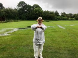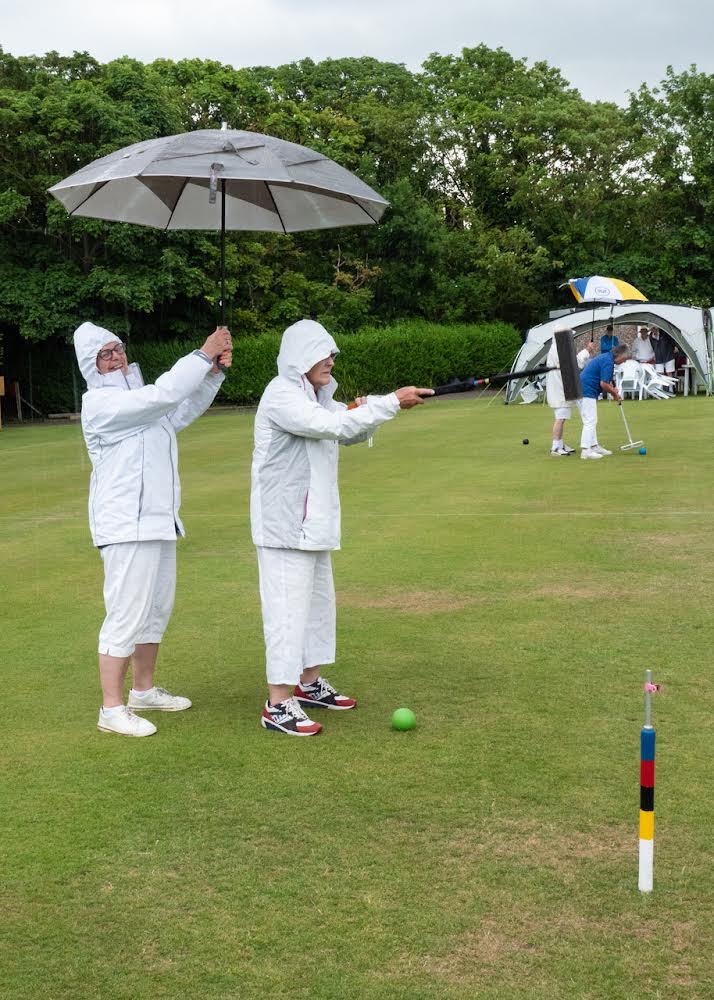 Doubles partners help out!Barbara writes: On Saturday, in heatwave conditions, the "Walker" trio won 3 games out of 5 leaving us in 4th place. The Sunday forecast was for rain and thunder after lunch and it was accurate. The Sunday morning games were won by Barbara & Ursula 7 - 6 and Ted & Claire 8 - 4. The predicted rain arrived on time and in torrential conditions Ursula & Claire produced the win of the day 7 - 6 against Westmorland. Barbara & Ted prevailed over LLanfairfechan 7 - 5 also in the rain, in what was noted as the fastest game of the tournament. Playing against the Bury pair, using the advantage system meant they had to score 8 hoops to our 7. At 6 - 7 in their favour, we scored the next hoop to win 7 - 7 and it was this result that decided the game and retained the shield for Fylde.
