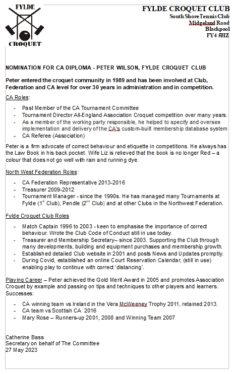 Peter says: To receive this from John at The Croquet Club's gala dinner was overwhelmingly surprising. Surrounded by my friends it was an amazing experience. Thank you to FCC for the kind thought and nomination.