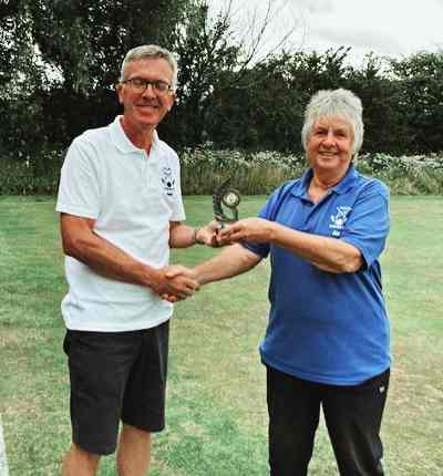 Presentation by John Haslam: Photo and caption by Catherine.Peter writes; In the advanced, Liz and I chose to play alternate shot. On Saturday nobody got close to pegging out, mostly due to the waterlogging. We beat Bowdon and lost narrowly to Crake and Bury. On Sunday, we faced everyone else, mano a mano, in Advanced One Ball, we got 6/12 between us.