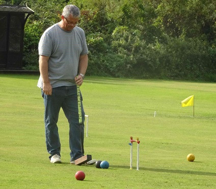 Ian and Stewart played the doubles and Alison singles. The first team were Bury and Alison had a good win. We knew that we needed 2 wins in the next round against Llanfairfechan and although Alison had a good start with a 3 ball break, getting to Rover using only 2 bisques, her opponent also made a strong start and peeled a couple of his hoops during his first turn. With a full complement of bisques he won the game 14-10.