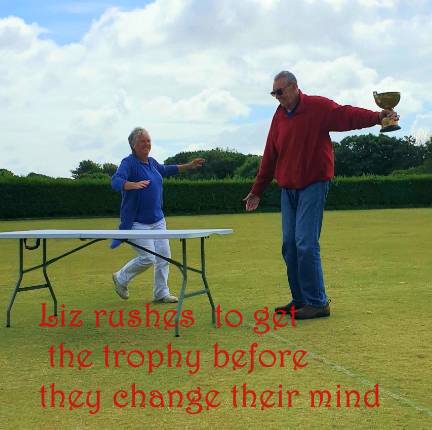 The pivotal game in the handicap competition came when Betty played Lee. All was going well for Betty until she squandered two bisques after almost garotting herself by getting her mallet caught by her dangly necklace whilst playing a big croquet stroke. This meant that after using her last bisque to posthumously peel rover, Betty was left on peg and peg with Lee on peg and 1. Lee missed and Betty tried a speculative peg out from beyond rover, missing with the front ball but pegging the other ball off. Lee shot at partner but missed again, leaving Betty a 5 yard peg out to win the game. Betty missed, leaving Lee to do a 3 ball break, rover peel and peg out to win +1. And so with both of us ultimately winning 6 handicap games out of 8 if was Lee who got the winner's trophy with Betty the runner up.