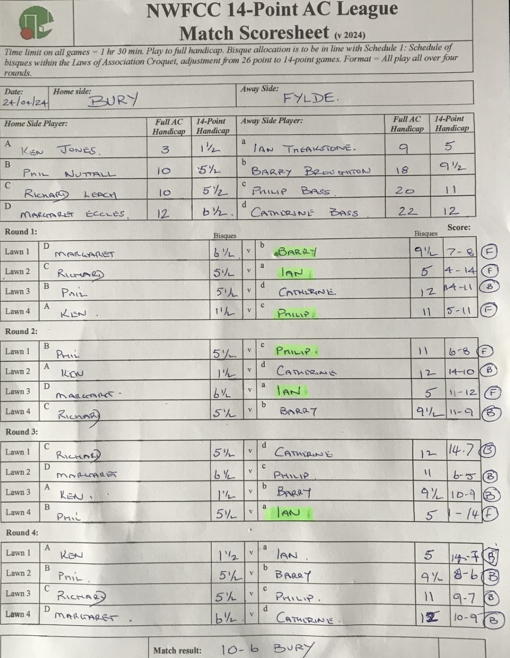Fylde started off at a blistering pace winning all of the round 1 games . 4-0 to Fylde felt good. Could Fylde keep the pressure on. In round 2 Fylde won 3 out of the four. Benedict winning 14-10 against Jon, Alison very fortunately beat Robin 11-10. It was a golden hoop, all clips on rover. Robin had the first approach and rushed his ball 2 m to the side of the hoop. The question was should he play a croquet shot to get in front of the hoop and score the winner or split Alisons balls up, both of hers were hiding in the corner. He chose the latter, but missed a fairly short roquet and Alison took her chance and scored the hoop. Barry beat Paul 14-1and Sarah, their rookie beat Ian 14-1.