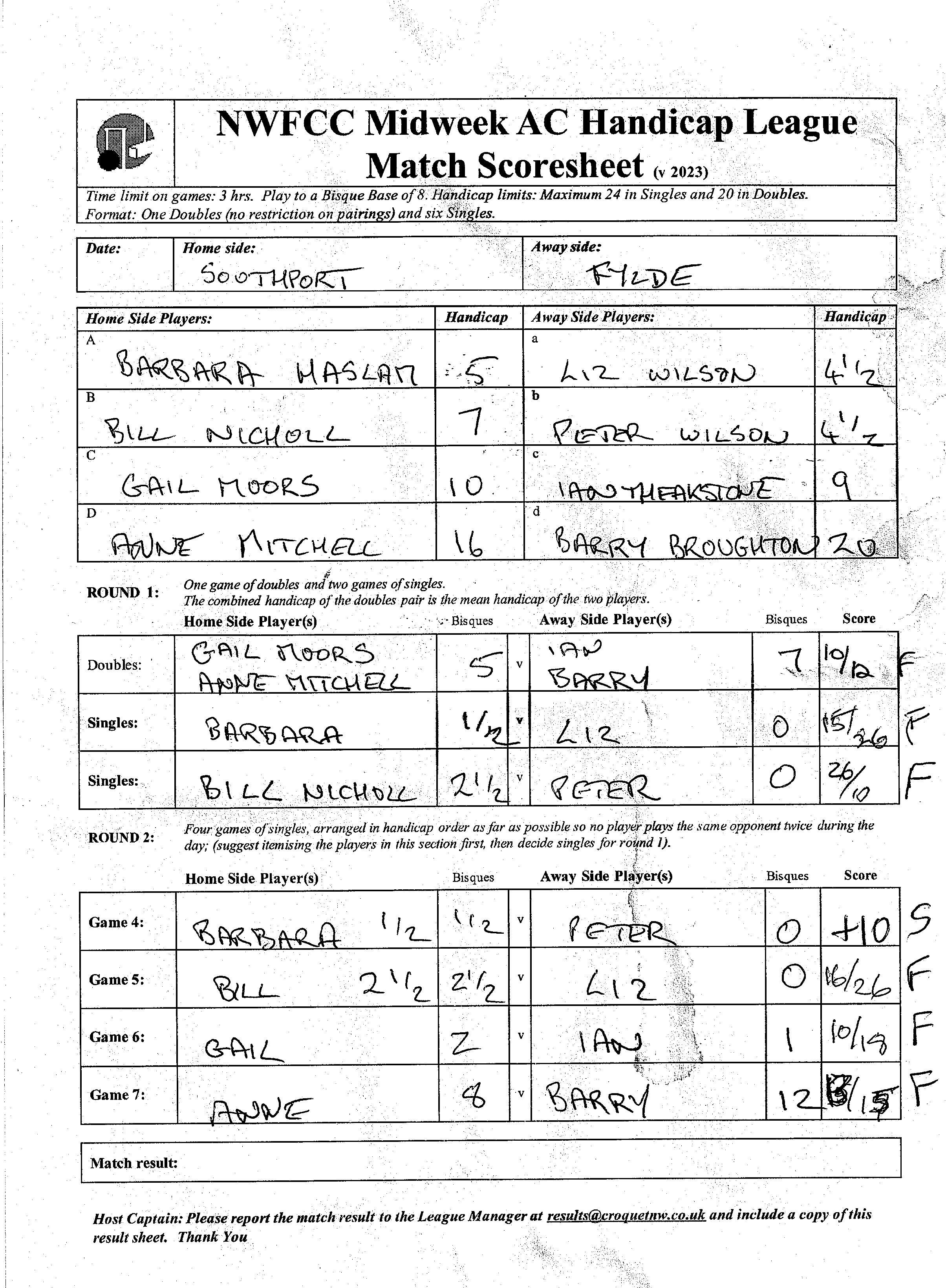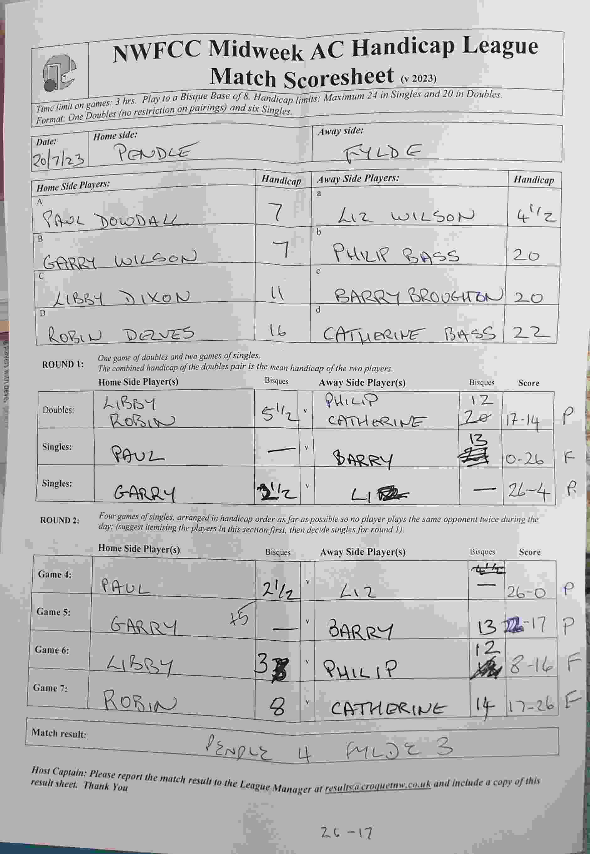 The pairing of Liz and Barry beat Robin and David 26-0 Barry made good use of his bisques and controlled the four ball break fabulously. Betty beat Helen 26-5 and controlled the game throughout with Helen unusually missing her short roquets. Paul and Andrew's match was a tussle with Paul eventually the victor winning 14 -13 Result at half time Fylde 2-1
