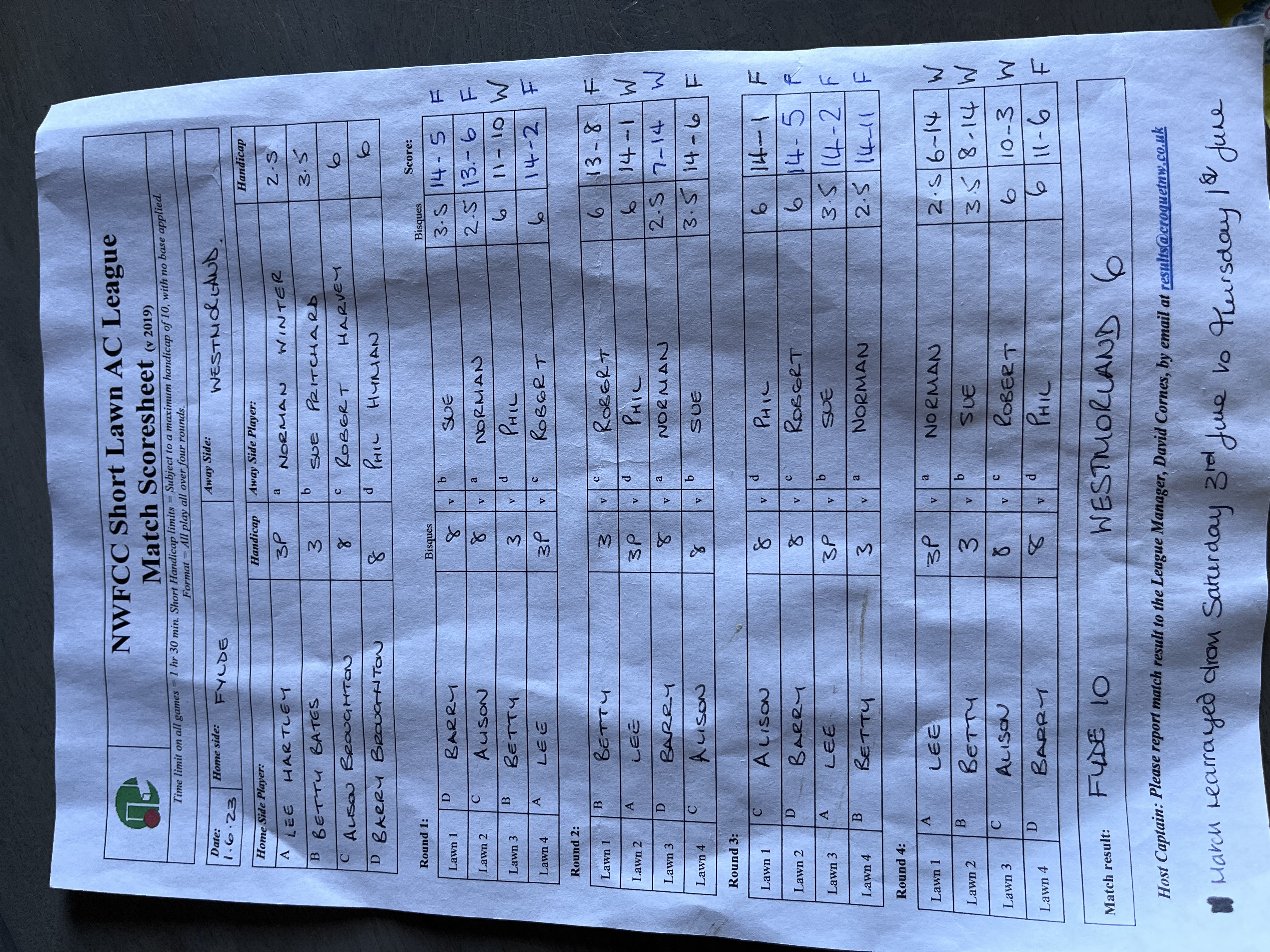 The Westmorland team were welcomed to Fylde by beautiful blue skies and a light breeze all day. In Round 1 we took 3 out of the 4 games. Betty had a very close game against Phil which had all 4 pegs on Rover when time was called. Phil finally got the extra point to win 11-10. Barry beat Sue 14-5, lying prone on the lawn to ensure he got the peg. Alison won 13-6 against Norman and then Lee, who had to incorporate his 3 peels into his short game, won 14-2 against Robert. In Round 2 Sue pegged Alison off leaving her to go round with 3 balls. Adrenaline kicked in and Alison won 14-6. We were all obviously revitalised after lunch ( and a quick peel tutorial from Lee, thank you ) took all 4 games in round 3! Betty vs Norman was a close game with Betty winning 14-11.