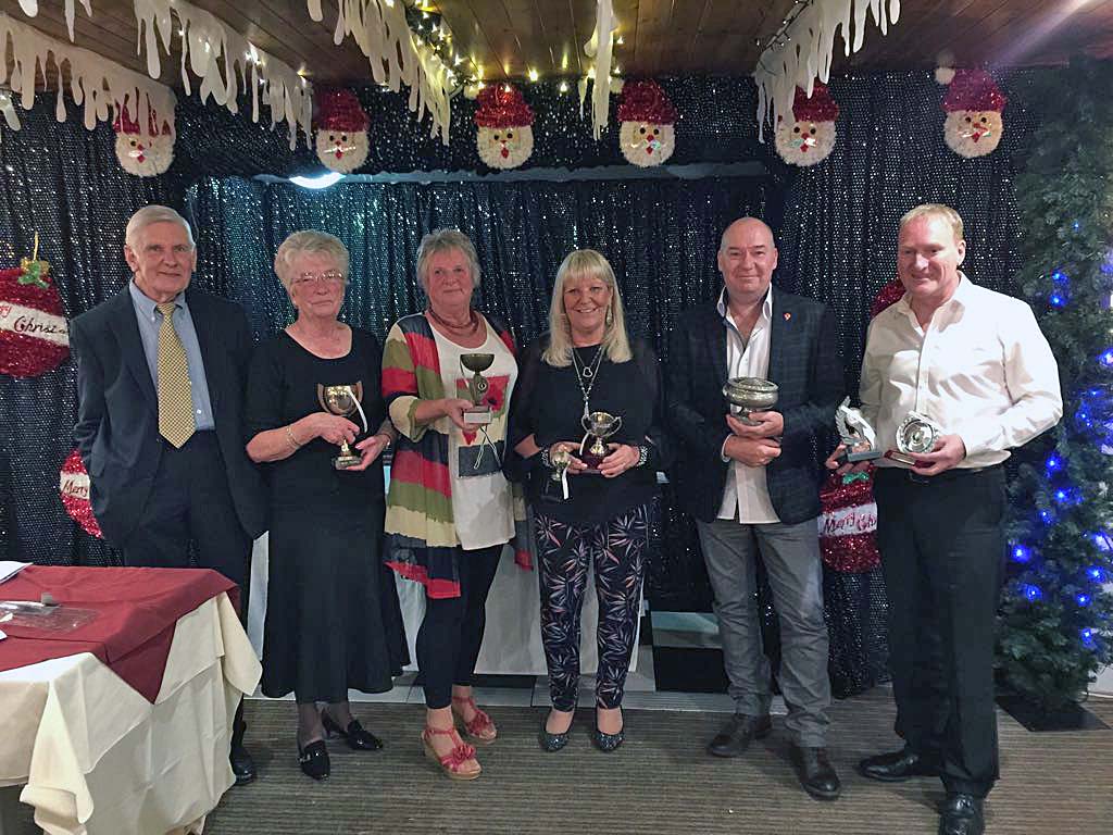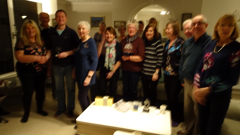 The food was excellent and plentiful. New Social Secretaries Jan and Cyd made a great job of it (ensuring they will be well supported when it comes to election time at the AGM) and everyone had a wonderful time. Over 70 pounds was made for club funds despite fewer attendees this year. The usual seat swapping ensured everyone had the opportunity for plenty of socialising. Picture shows (from the left) Internal competition winners Terry (Cyd accepted in his absence) Jan, Lee (accepting an external tournament trophy) Sue and Nathan (who won a handful!)