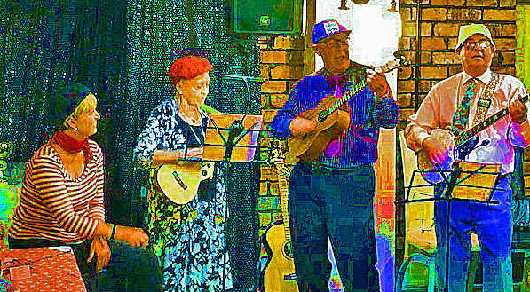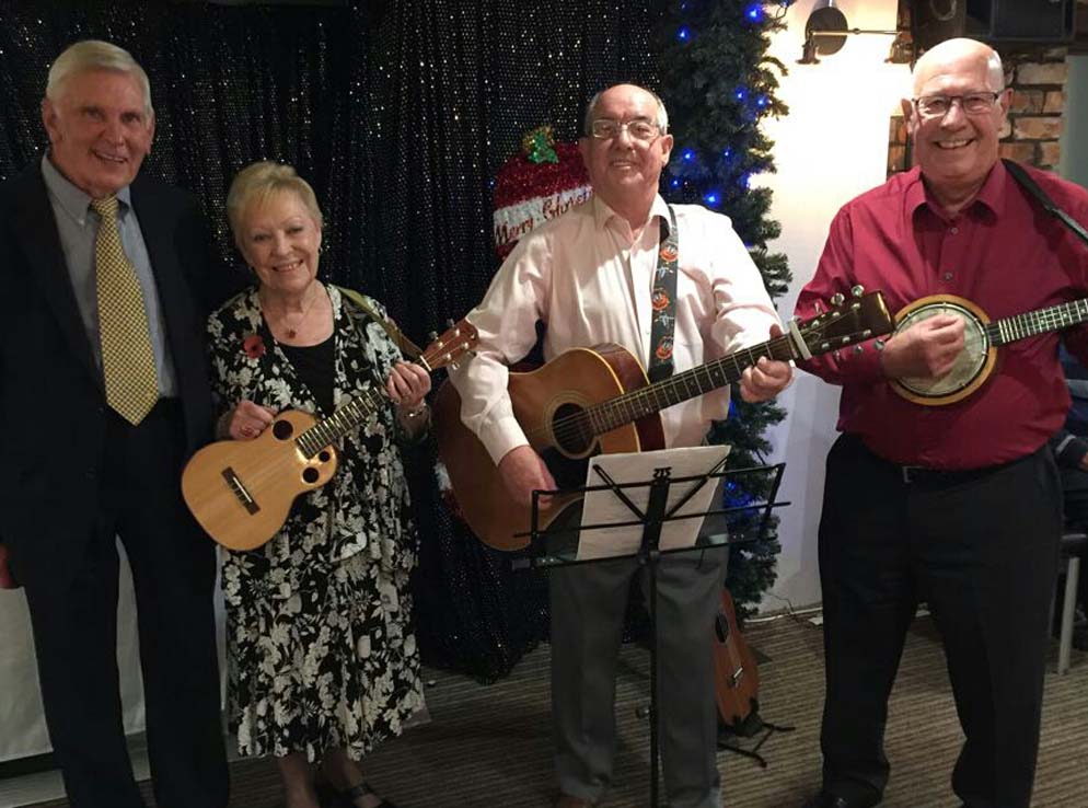 L to R, Martin Bradshaw (Chairman), Sue Ellsmore, Liz Wilson, Jan Smith, Andy Brandwood, John Cutler.We then had some live music from 'Triple Peel' our club's band. Using various specialised Ukuleles they started with a composition celebrating the achievements of our retiring Chairman. Was that a tear in his eye during the verse with Longman wins in it? They followed it with some Alabama Blues.
