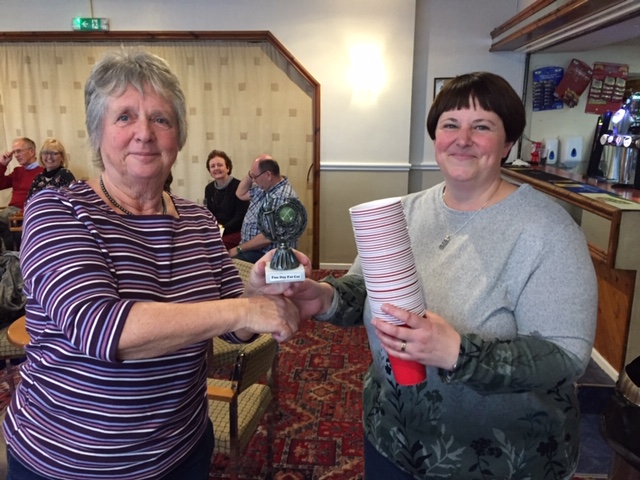 Liz presents Betty with the Funday Cup.To play those we split into teams, but came together to eat lunch. That was followed by a very entertaining reverse raffle. Everyone was given 5 tickets and the first six tickets won the pick of six prizes. But the ticket picking continued to the last ticket from the hat. If you number came out you could steal any prize from someone. It was great fun.