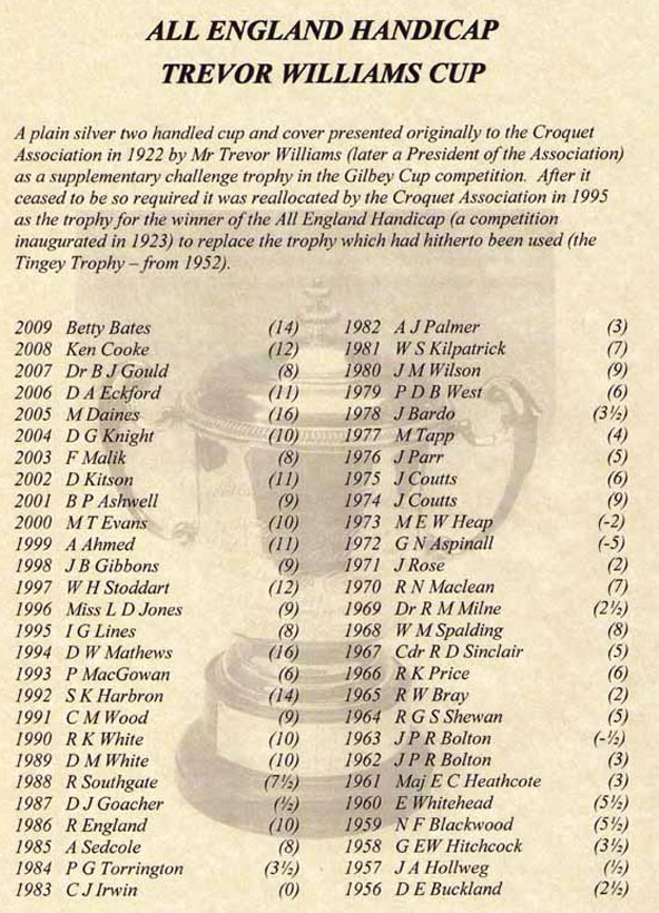 Guustav Fomalhault of Fylde Croquet Club interviwed Betty on her return. Q: Tell me a little bit about yourself and how you started to play croquet? I am a teacher. My partner is Lee Hartley we have been together for 7 years. Neither of us had played croquet before.We went to an open day for croquet in 2004, as a thought that we might do something together. We both enjoyed it, so we have been members of FCC ever since. Q: What has croquet taught you? Not to rush into things. How to get through hoops at ridiculous angles. Q: Where is your favourite place to play croquet? Home at SSTC of course and Pendle. Q: This year the final was held at Roehampton on 20th and 21st September 2009. What was the club like? Modern facilities with carpet green lawns. Hut is understated but grounds expansive. Extensive leisure facilities including state of the art gym, putting greens, golf course,tennis courts and self service restaurant as well as an la carte restaurant. Q: What was the format of the tournament? Swiss. Q: What was the most challenging situation in the final and how did you react? On the last match we were neck and neck with 3 minutes to go. His balls were lined up for a rush to his hoop and my balls were spread out. I knew if I didn’t get the next shot it was curtains so I ‘geed’ myself up and told myself off and said ‘I can do it!!!’ I did a relatively long roquet moved to three back but I was so nervous I had to come away from the hoop and steady myself as I was shaking so much the mallet was rocking. I went on to run a further two hoops. With time called I decided not to carry on as an error would leave him on so I split his balls up leaving him he 20 yard roquet which he proceeded to miss. Q: At what point did you know you might win the tournament? I never did. Mark Godfrey spoke to me after my third win and said that a number of players were on three wins, but if we both win then he would be above me in ranking because he beat me. I suppose the pressure was off because he came over to our game and told me he had won and had no inkling that I was in with a shout. Q: Your club is Fylde who win the New Zealand Tray with your victory. How have the club members reacted to your success? Absolutely fantastic. I have had many emails and telephone calls from proud FCC members honoured that the prestigious trophy has ‘come up North’. The comradery at our club is always good and we always share each others' successes. Our small hutted club is on record books as having produced an All England winner! Q: When did you know you had won? I was putting my mallet away and there was a lot of commotion with mumblings that there were a number of players on four wins. My ears pricked up when I heard Douglas the organiser mention my name. I turned around in the busy hut and looked at Douglas and then he said you’ve won by one point. Q; What was your reaction to finding you had won? First of all I screamed (I have never done that before), then I cried. The players from the North west all crowded towards me all pleased as punch, I just picked Eilleen Gallagher up and twizzled her around, I was ecstatic. It was my first tournament trophy. Then I felt devastated ..I had no make up on, my hair was a mess and felt as fat as a pig. But WOW… UNBELEIVABLE… but what a pleasant 5 hour journey home.